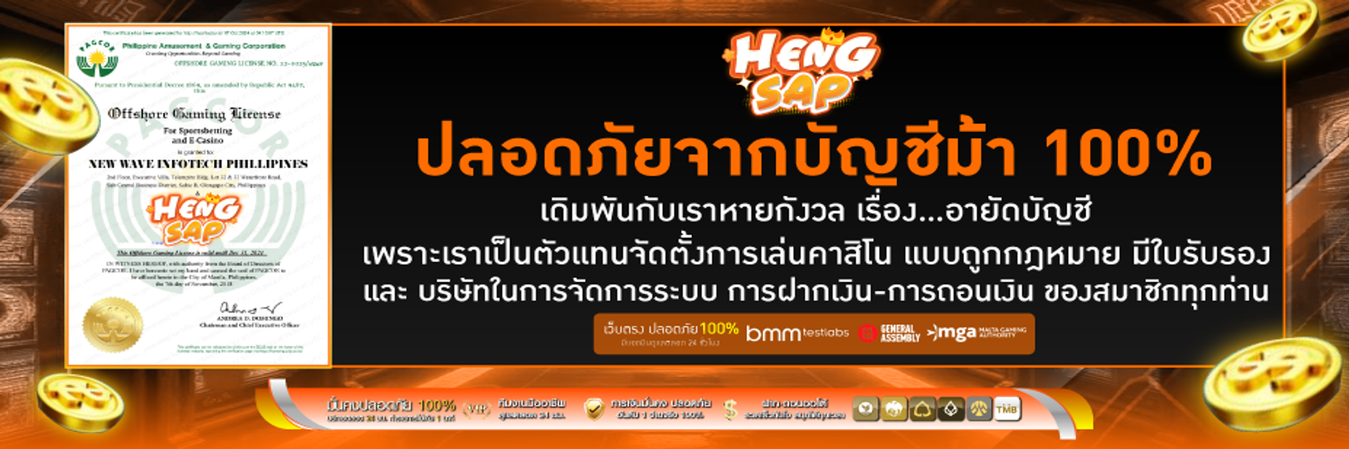 เรายังได้รับการรับรองมาตรฐานจากหน่วยงานระดับสากล และมีใบอนุญาตการเล่นเกมที่ถูกต้องตามกฎหมาย ทำให้คุณมั่นใจได้ว่าการเล่นเกมกับ Hengsap นั้นโปร่งใสและเป็นธรรม ระบบการจ่ายเงินของเราก็ได้รับการตรวจสอบและรับรองจากผู้ตรวจสอบอิสระ เพื่อให้แน่ใจว่าทุกธุรกรรมมีความถูกต้องและปลอดภัย